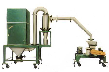 From the hopper, materials enters into crush room by screw conveyer; and be cut and grinded by high-speed rotating blade. Then to send materials into cyclone separating device and bag filter with the negative wind speed